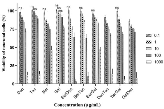 SH-SY5Y cells were treated with the ChEIs and two-drug combinations, and cell viability assessed using a MTT assay. Drugs were applied over a concentration range of 0.1, 1, 10, 100, and 1000 µg/mL for 48 h and cell viability compared with vehicle-treated control cells (set at 100% viability). The toxicity of the individual ChEIs to neuronal cells is shown in Figure 5. At the lowest concentration employed, 0.1 µM, none of the drugs were toxic to neurons (marked as non-significant changes from controls). A concentration of 1 µM (and above) of donepezil or berberine was able to induce toxicity, whereas at least 10 µM of tacrine or 100 µM of galantamine was needed to reduce cell viability. The drug (inhibitor) concentration that reduced cell viability by 50% (IC50) was determined by non-linear regression, with values listed in Table 3. The order of toxicity of the ChEIs was donepezil > tacrine > berberine > galantamine. Dual-drug combinations were generally more toxic to neuronal cells with lower IC50 values, apart from a BerGal combination that was relatively non-toxic (Figure 5 and Table 3).