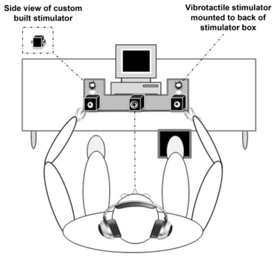 Participants completed a simple reaction time paradigm employing three sensory conditions that were presented bilaterally: two unisensory (visual and somatosensory) and one multisensory (simultaneous visual-somatosensory). Specific details regarding the multisensory experimental protocol, equipment, and data processing procedures are available []. In short, individuals were seated and instructed to quickly press a foot pedal as soon as they saw or felt stimulation from the multisensory apparatus (see also Figure 1 adapted from []). Visual and somatosensory stimuli were delivered through a custom-built stimulus generator (Zenometrics, LLC; Peekskill, NY, USA) that consisted of two control boxes, each housing a 15.88 cm diameter blue light emitting diodes (LEDs) and a 30.48 mm × 20.32 mm × 12.70 mm plastic housing containing a vibrator motor with 0.8 G vibration amplitude. The devices were connected to a network control center, which allowed direct control for each device through the testing computer’s parallel port. The devices were cycled on and off at precise predetermined intervals. A TTL (transistor-transistor-logic, 5 V, duration 100 ms) pulse was used to trigger the visual and somatosensory stimuli through E-Prime 2.0 professional software.