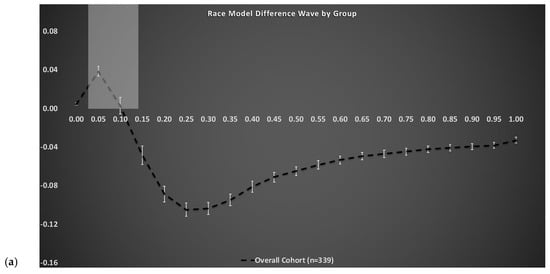 Methods to calculate the race model violation have been previously described []. Figure 2a depicts the group-averaged difference between actual and predicted CDFs (dashed trace) for the entire cohort, where positive values (gray shaded area between 0 and 10th percentile) are indicative of VS integration (i.e., violation of the race model). The RMI was tested using Gondan’s permutation test over the fastest 10% of responses and robust violation was observed (tmax = 14.40, tcrit = 2.08, p < 0.001) [,]. As in our most recent work [,,], the area-under-the-curve (AUC) during the group averaged violated percentile bins (0–10th) served as the independent measure of magnitude of VS integration. Note, the higher the magnitude, the better (i.e., more efficient) the VS integration ability.