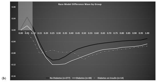 The race model difference waveform for the overall cohort is depicted in Figure 2a (dashed trace). Overall, our results reveal significant and robust VS integration effects (RMI violation or positive values) over the fastest 10% of RTs (highlighted gray box) using an established permutation test []. Figure 2b depicts race model difference waveforms by diabetes status, where the solid black trace represents individuals without diabetes, the solid white trace represents individuals with diabetes not on insulin therapy, and the gray dashed trace represents individuals with diabetes on insulin therapy. As shown in Figure 2b, magnitude of area-under-the-curve during the fastest 10% of RTs (highlighted gray box) significantly decreases with increased severity of diabetes.