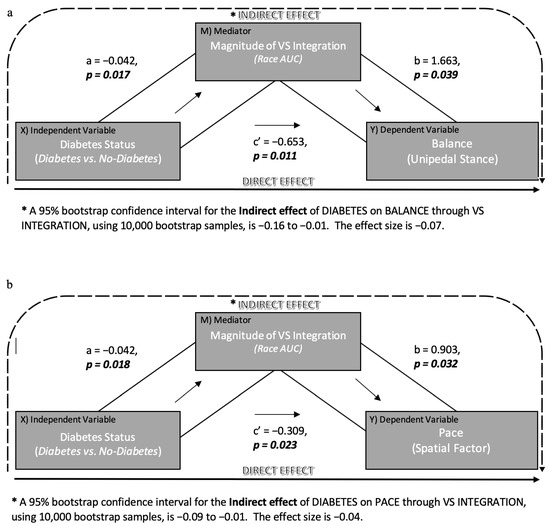 Mediation Analyses. Mediation models along with the results for (a) the influence of diabetes on balance through magnitude of VS (visual–somatosensory) integration and (b) the influence of diabetes on spatial aspects of gait through magnitude of VS integration AUC: area-under-the-curve.