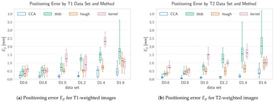 The visibility of the marker spheres depends on the chosen modality, because T1- and T2-weighted MRIs serve different image contrasts concerning to different tissue types. Since the spheres consist of a fluid bulk, surrounded by a non-fluid shell, the intensity as well as the sharpness of the sphere outline is much higher in T2-weighted images as depicted in Figure 1. However, the positioning as well as the spacing error do not suffer from differences in contrast or image intensity due to different imaging modalities, as can be seen in Figure 8 and Figure 9. When considering the positioning error, a slightly higher overall maximum median error of (kernel method at ) can be observed for T1-weighted images compared to the results from T2-weighted image, which may be addressed by the previously mentioned reasons.