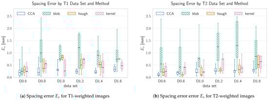 Since the underlying manual segmentation result tends to be subjected to errors, due to the non automated manner of conduction, a further measure for localization accuracy and precision was taken into account. Therefore the deviation of the relative distance between two marker-spheres of the same marker and the constructive-wise fixed distance value of was evaluated, which will be referred to as spacing error and is depicted in Figure 9a for T1-weighted and in Figure 9b for T2-weighted images, respectively. Consequently, this measure can only be applied where both spheres have been recognized and will merely result in one value per two spheres.