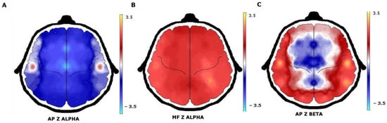 QEEG with neurometric analysis of patients with juvenile myoclonic epilepsy. (A) A generalized decrease in alpha absolute power in the frontocentral regions with (B) an increase in alpha mean frequency. (C) The beta absolute power increase was observed in the temporal and occipital regions.
