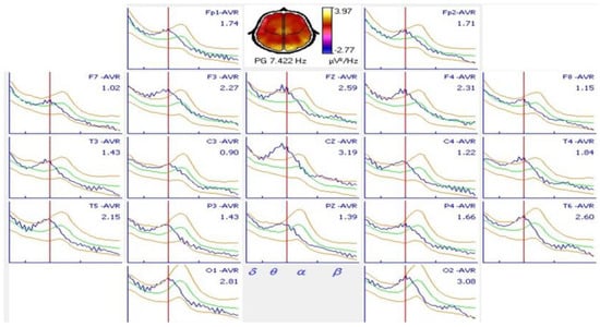 The abnormalities in the MF of each frequency band were much less frequent. An increase in theta MF was observed only in 26.8% of patients, and a decrease in delta MF was found in 43.9%. In the spectral analysis, the alpha peak was found at 9.95 ± 0.85 Hz, with a greater amplitude in the occipital regions on the O1 and O2 electrodes. This spectral result may be explained because the majority of studies with EEG visual analysis obtained normal results since the alpha activity is the frequency that dominates the background of EEGs, so if this activity is normal in frequency, it is easy to conclude that all EEG activity is normal. On the other hand, the MF of the delta, theta, alpha, and beta bands had different but not significant results when the analysis of patients with and without antiepileptic treatment was performed. The same happened with the frequency of the spectral peak alpha. This does not mean that patients with JME do not have alterations in the background activity of the EEG, but rather that these alterations are not due to antiepileptic treatment and are most likely a consequence of the epilepsy itself [].