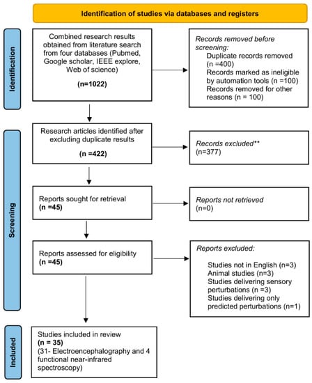 Search results obtained from four research databases yielded a total of 1022 research articles. After removing all the duplicate results via Mendeley we extracted 422 original research articles. After reviewing the abstracts of all these articles, a total of 45 articles were included. The reasons for exclusion of other 377 were (1) studies that delivered predicted mechanical or sensory perturbations for examining cortical activity, (2) studies that delivered unpredicted sensory perturbations (i.e., visual or proprioceptive perturbations, (3) intervention studies that examined the effect of treatment on changes in cortical activity to unpredicted perturbations, (4) studies that delivered unpredicted perturbations to assess changes in cortical activity in children and adolescents (below 18 years of age). The remaining 45 articles were assessed for eligibility and 10 were removed based following points: (1) studies that were not in English, (2) Animal studies, (3) Studies that delivered sensory perturbations, and (4) Studies that delivered only predicted perturbations. This was followed by full-text examination that yielded a total of 35 cross-sectional studies that assessed changes in cortical activity during novel or repeated unpredicted mechanical perturbations (Figure 1) [,,,,,,,,,,,,,,,,,,,,,,,,,,,,,,,,,,].
