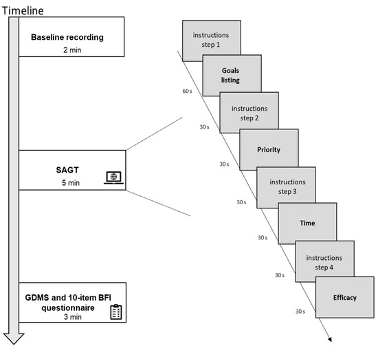 Experimental procedure and the SAGT. The figure shows the experimental procedure and the SAGT steps. Throughout the duration of the task, EEG and autonomic activity were detected to complement and enrich observations based on participants’ behavioral data. SAGT: Self-Awareness of Goals Task; GDMS: General Decision -Making Style; BFI: Big Five Inventory.