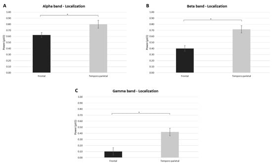 Additionally, for the gamma band, a significant main effect was found in the within-subject factor Localization (F[1,34] = 25,721, p ≤ 0.05, η2 = 0.720), with an increase in the power of this band in the temporoparietal compared to the frontal locations (Figure 3C). No other significant differences were found, and no significant differences were found for the other EEG frequency bands (delta and theta bands).