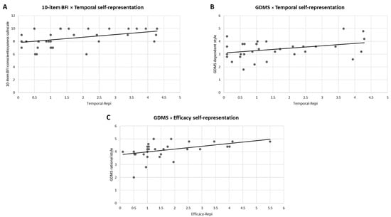 Pearson correlations. (A) The scatter plots display a significant positive correlation between the temporal representation SAGT index and conscientiousness. (B) The scatter plots display a significant positive correlation between the temporal representation SAGT index and a dependent decision-making style. (C) The scatter plots display a significant positive correlation between the efficacy representation SAGT index and a rational decision-making style.