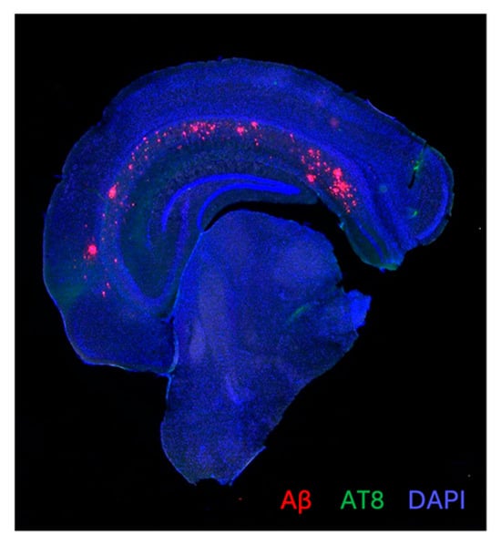 In accordance with McNerney et al. (2022) [], to confirm the presence of plaques and tangles in the 3× mice, a dual staining procedure for Aβ and phosphorylated-tau was conducted with Aβ (dilution 1:1200, Cell Signaling, Danvers, MA, USA) and AT8 (dilution 1:1200, ThermoFisher, Waltham, MA, USA) antibodies. Floating brain slices (30 μM thick) were first rinsed in 1× PBS, followed by permeabilization in PBS containing 0.3% triton and then blocking in 10% normal goat serum. The slices were then incubated with the primary antibodies overnight at 4 °C, rinsed in PBS, and subsequently exposed to secondary antibodies 1:500 (ThermoFisher, Waltham, MA, USA) for 1 h at room temperature. DAPI 1:1000 was introduced during the final rinse. Slices were mounted and cover slipped using Fluoromount (Invitrogen, Waltham, MA, USA) for imaging under a Keyence microscope. Quantification of plaques and tangles was performed using ImageJ software (version 2.14.0/1.54f) in the dorsal cortex, ventral cortex, septal nucleus, hippocampus, and subiculum and normalized to the total area of each region examined.