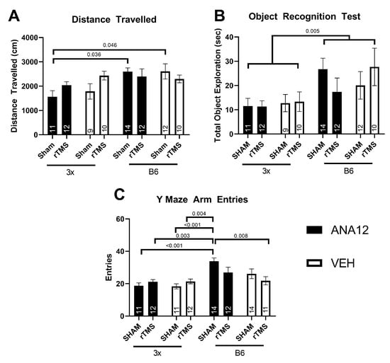 First, the total distance traveled in the open field test over the ten-minute testing period was investigated to determine overall exploration differences between groups. An interaction effect between genotype and treatment was found on the total distance (three-way ANOVA effect of genotype × treatment F(1,82) = 5.81 p = 0.018, partial η2 = 0.066), the genotype effect is consistent with McNerney et al., 2023 [] (Figure 2A). Post hoc testing revealed that 3x-ANA12-Sham mice traveled less distance than B6-ANA12-Sham or B6-Vehicle-Sham mice (Tukey’s p < 0.05); however, the 3x-ANA12 mice treated with rTMS had an increase in distance traveled such that they were not statistically different from B6-ANA12-Sham or B6-Vehicle-Sham mice (p > 0.05). To further characterize overall activity and exploration, we analyzed the exploration time in the ORT and the total entries in the Y-Maze tasks. For the familiarization phase of the ORT, there was a significant effect of genotype (Three Way ANOVA Effect of Genotype F(1,82) = 8.51, p = 0.0025 partial η2 = 0.094), suggesting that 3× mice explored object less than the B6 regardless of treatment (Figure 2B). In the Y-maze, there was an interaction between genotype and treatment in the number of entries in the Y-maze task (three-way ANOVA effect of genotype × treatment F(1,89) = 6.59, p = 0.012, partial η2 = 0.069, Figure 2C). Post hoc tests revealed B6-ANA12-Sham mice had a greater number of entries than all 3× groups and also more than B6-Veh-rTMS (Tukey’s p < 0.05). Lower exploration in AD mice is consistent with previous research [,], but given the extent of the exploration differences and the number of mice that did not reach criteria for inclusion in the NOR task, quantification of memory performance was not considered appropriate. Similar results were found in the OPT. We recognize this as a shortcoming to be researched further but have previously demonstrated memory deficits with this model [].