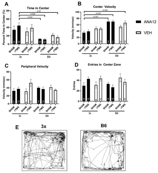 This study aims to expand on recent reports of abnormal behavior in 3xTg-AD mice including reduced velocity but increased time in the center of an open field task which have been linked to apathy or disinhibition [,,]. Using characterization of abnormal behavior in the open field as reported previously [], the effects of rTMS and BDNF on behavioral changes in an AD mouse model were explored. Twelve-month-old 3xTg-AD (3×) or B6129SF2/J wild type (B6) mice were injected with a non-competitive TrkB receptor antagonist, ANA12 [], or Vehicle (saline/control) 2 h before treatment with rTMS. By inhibiting the BDNF pathway, ANA12 could be a key agent in revealing the mechanism through which rTMS influences behavior. We hypothesized that rTMS would reduce hypoactivity and time spent in center in the open field task, while ANA12 would abolish this effect.
