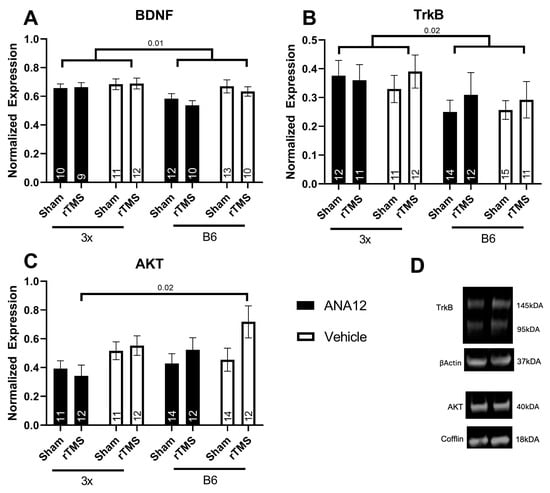 In terms of biochemistry, injections of ANA12 did not directly influence TrkB but did result in reduced expression of one downstream component, AKT. While previous studies have uncovered an effect of ANA12 on TrkB phosphorylation [], the timeframe of this study did not permit this measurement, but given the decrease in AKT, it is likely that manipulations in this study had a similar effect. Our previous research demonstrated that rTMS influenced ERK and PLCγ but not AKT [], therefore the specificity of the inhibitory effect of ANA12 and antagonizing effect of rTMS should be investigated further to understand the BDNF-mediated mechanism of rTMS. Similarly, BDNF was associated with genotype and injection, such that ANA12 reduced BDNF only in B6 mice. This may be an indication of an alteration in TrkB function in 3× mice, possibly from the increase in the Truncated-TrkB isoform previously reported in this model [].