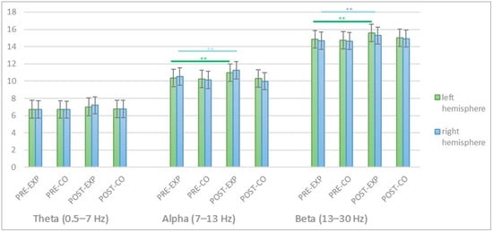 Considering the alpha band, the ANOVA model for repeated measures revealed a significant effect of the factor Phase (F (1, 29) = 33.11, p < 0.01, η2 = 0.09), indicating a difference between the pre and post test results. This result is confirmed by the results in each single hemisphere in Figure 1 and Table 2. The Group X Phase interaction showed significant effects (F (1, 59) = 40.61, p < 0.01, η2 = 0.11. To further explore the nuances of the Group X Phase interaction, contrast terms were applied to investigate where precisely the effect occurred and its directional impact. Specifically, contrasts were utilized to assess the significance of differences between pre-test and post-test within both the experimental and control groups. Results indicated that contrast C1, representing the difference in the alpha band between pre-test and post-test values for the experimental group (C1 = μExp, Post − μExp, Pre), was statistically significant (p < 0.05). Similarly, contrast C2, representing the corresponding difference for the control group C2 = μCtrl, Post – μCtrl, Pre), was not significant (p = 0.11). These contrast terms provide a more detailed understanding of how the “Group X Phase” interaction manifests in the alpha band. Moreover, nor hemisphere side, neither phases X hemisphere side, neither group X hemisphere side showed significant effects. Considering the beta band, a significant effect of the factor Phase emerged (F (1, 29) = 5.27, p < 0.01, η2 = 0.11), indicating a difference between the pre and post test results. The Group X Phase interaction showed also significant effects (F (1, 59) = 35.73, p < 0.01, η2 = 0.11, suggesting that neurocognitive stimulation using Erigo device resulted in significant differences between the EG and CG in the beta frequency bands. Again, contrasts were utilized to assess the significance of differences between pre-test and post-test within both the experimental and control groups. Results indicated that contrast C1, representing the difference in the beta band between pre-test and post-test values for the experimental group (C1 = μExp, Post − μExp, Pre), was statistically significant (p < 0.05). Similarly, contrast C2, representing the corresponding difference for the control group C2 = μCtrl, Post – μCtrl, Pre), was not significant (p = 0.24). These contrast terms provide a more detailed understanding of how the “Group X Phase” interaction manifests in the alpha band. Again, neither hemisphere side, neither phases X hemisphere side, neither group X hemisphere side showed significant effects. Considering the theta band, no difference between the pre and post test results emerged. Nor hemisphere side neither phases X hemisphere side shows significant effects.