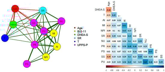 Empirical network with the age, testosterone, DHEA-S, UPPS-P, and SR domains (partial correlations). Nodes represent domains. The edges represent the relationship among the domains. The thicker the edge, the greater the relationship between the domains. Green and red lines represent positive and negative relationships, respectively. AI: Attention, MI: motor (MI), NPI: Non-Planning, SR: Sensitivity to Reward, NU: Negative Urgency, PR: Lack of Premeditation, PS: Lack of Perseverance, SS: Sensation Seeking (SS), and PU: Positive Urgency.