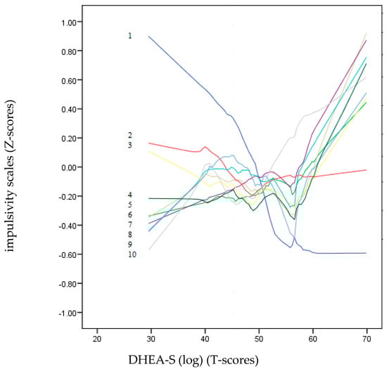LOESS plots for DHEA-S (T-score) (dependent variable) and impulsivity scales (independent variables): 1: Ae, 2: Lack of Premeditation, 3: Attention, 4: Non-Planning, 5: Positive Urgency, 6: Motor, 7: Negative Urgency, 8: Sensation Seeking, 9: Lack of Perseverance and 10: Sensitivity to Reward (Z-score). The positive predictions of the independent variables on the dependent variable (DHEA-S) are located on the lines above “zero” T-scores.