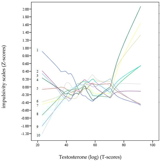 LOESS plots for testosterone (T-score) (dependent variable) and impulsivity scales (independent variables): 1: Age, 2: Lack of Premeditation, 3: Lack of Perseverance, 4: Non-Planning, 5: Negative Urgency, 6: Positive Urgency, 7: Attention, 8: Motor, 9: Sensation Seeking, and 10: Sensitivity to Reward (Z-score). The positive predictions of the independent variables on the dependent variable (testosterone) are located on the lines above “zero” T-scores.