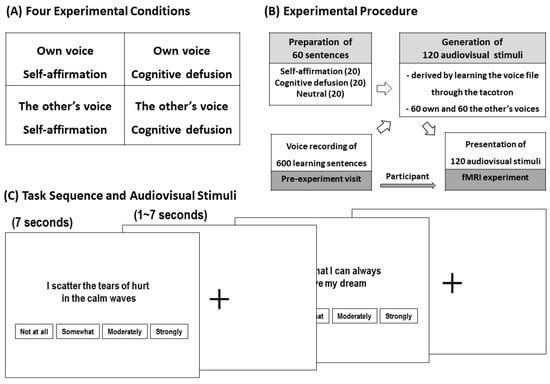 A total of 27 healthy right-handed adults (12 males/15 females) were initially recruited into the study. Sample size was calculated through a power analysis (G*Power 3) [] with a medium-sized effect of 0.5 and 80% power at an alpha level of 0.05. Exclusion criteria included the presence of a neurological, psychiatric, or significant medical illness, current or past history of substance abuse or dependence, and participation in a psychotherapeutic setting. Due to technical difficulties in synthesizing one’s own voice during the process of generating audio–visual stimuli for fMRI scanning, the stimuli for six participants did not reach a level suitable for the experiment. Accordingly, the remaining 21 participants (8 males/13 females, mean age ± standard deviation: 25.6 ± 4.3) for whom auditory–visual stimuli were successfully prepared participated in the fMRI experiment.