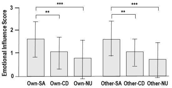 Behavioral responses in four experimental and two control conditions: own-voice and self-affirmation (Own-SA), own-voice and cognitive defusion (Own-CD), own-voice and neutral (Own-NU), other-voice and self-affirmation (Other-SA), other-voice and cognitive defusion (Other-CD), and other-voice and neutral (Other-NU) conditions. ** p < 0.01, *** p < 0.001.