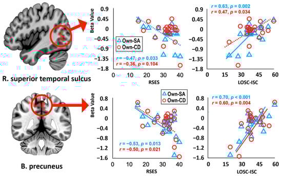 Significant correlations between regional activity and psychological assessments in the brain regions showing the interaction effect between voice identity and emotion regulation strategy. The solid and dotted lines in the graph represent significant and non-significant results after Bonferroni correction, respectively. Abbreviation: B., bilateral; R., right; Own-CD, the own-voice cognitive defusion condition; Own-SA, the own-voice self-affirmation condition; RSES, Rosenberg Self-Esteem Scale; LOSC-ISC, Levels of Self-Criticism Scale–Internalized Self-Criticism.