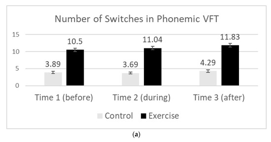There was a main effect of the group in the number of switches (F(1, 81) = 307.33, p = 0.000, ηp2 = 0.964); the exercising participants produced more switches than the control group participants (Mexercise = 10.7 (1.73); MControl = 4.8 (1.1)). There was an interaction of the type of test and experiment such that the exercising participants produced more switches versus the control group participants, with this difference being the most pronounced in the phonemic task (F(1, 162) = 23.11, p = 0.000, ηp2 = 0.22). That is, the difference in the number of switches between the exercise group and the control group in the phonemic condition (Mexercise = 11.12 (2.52); Mcontrol = 3.95 (1.39); all ts > 11.24, ps < 0.001) was more pronounced than the difference in the number of switches produced in the semantic condition (Mexercise = 10.11 (1.91), Mcontrol = 5.61 (1.47)), all ts > 6.16, ps < 0.001). See Figure 3a,b. Thus, it appears that participants completing the VFTs while exercising did not produce a large number of words associated with one another, but, instead, switched from the type of word group to another often. Overall, the number of switches increased over time for both the experimental and the control group participants (F(2, 162) = 3.55, p = 0.031, ηp2 = 0.042), with a larger number of switches being produced after the session (Mafter = 8.64 (3.82)) than before (Mbefore = 7.68 (3.40); t(82) = 3.01, p = 0.004) and marginally more switched during (Mduring = 8.35 (3.81)), as compared to before the session (t(83) = 1.92, p = 0.059).