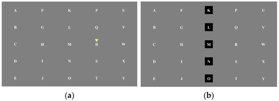 P300 experimental paradigm. (a) The target character is indicated by a yellow inverted triangle; (b) Random flashing of rows and columns.