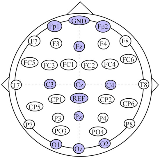 EEG data were acquired using a NeuSen W wireless digital 32-channel EEG amplifier (Borycon Technology Co., Ltd., Changzhou, China) at a sampling rate of 1000 Hz. Electrode placement followed the international 10–20 system. The ground electrode was positioned at FPz, and the reference electrode at CPz. The electrodes used in this study included Fp1, Fp2, Fz, C3, Cz, C4, Pz, O1, Oz, and O2, with the detailed electrode layout shown in Figure 2.