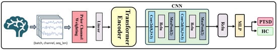 Based on the analysis of spatiotemporal differences in P300 signals between the PTSD and HC groups, channel-wise prior biases and attention priors from ERP information were further extracted. Building on this, we propose a P300 spatiotemporal feature model, P300-STTCNet, which integrates ERP priors with a hybrid transformer-CNN architecture. The model framework is illustrated in Figure 3.
