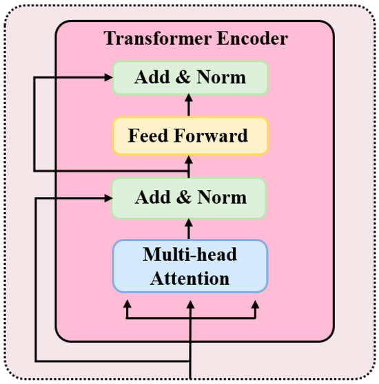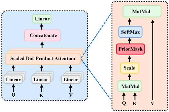 The MHA mechanism is the core component of the transformer encoder, designed to capture global dependencies across different positions in the input sequence, as illustrated in Figure 5. MHA consists of multiple parallel attention heads, each performing independent linear projections of the input sequence into query (Q), key (K), and value (V) representations, followed by feature interaction through scaled dot-product attention. Specifically, each head computes the dot product between Q and K to measure positional relevance, scales the result to stabilize gradients, incorporates a prior attention mask (PriorMask), and applies the softmax function to obtain attention weights. The weighted sum with V yields the head output. Finally, the outputs from all heads are concatenated and linearly projected to form the final MHA representation.