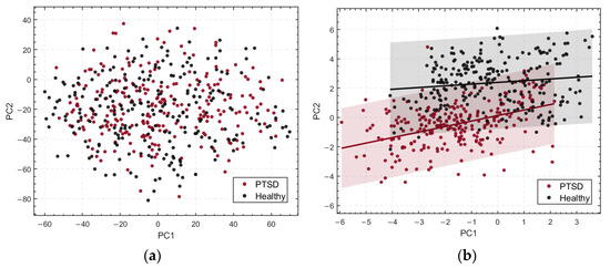 Differences between the PTSD group and the HC group on principal components PC1 and PC2. (a) Distribution of Raw Features; (b) Distribution of CSTP-Extracted Features, shaded regions indicate 95% prediction intervals.