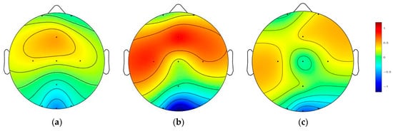 By calculating the average P300 signals across all participants in the PTSD and HC groups and visualizing the results using topographical maps, inter-group differences at the major electrode sites were further demonstrated, as shown in Figure 7. The left panel displays the average topographic map of the PTSD group, the middle panel shows that of the HC group, and the right panel presents the difference map (HC minus PTSD), with a color bar indicating the range of values. Clear inter-group differences were observed at the Fz, C3, and C4 channels, where P300 signal amplitudes differed markedly between the PTSD and HC groups.