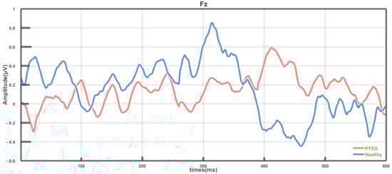 Further analysis revealed that, particularly at the Fz electrode, the PTSD group exhibited more pronounced differences in both amplitude and latency, with overall lower and flatter P300 waveforms. Within the 250–500 ms time window, the HC group displayed a more typical positive peak, whereas the PTSD group showed markedly attenuated amplitude. Additionally, the P300 peak latency in the PTSD group was delayed by approximately 103 ms compared to the HC group (HC: 312 ms; PTSD: 415 ms), indicating delayed or less efficient cognitive processing within this time window and reflecting potential deficits in information processing []. These results not only deepen the understanding of the neurocognitive mechanisms underlying PTSD but also support the utility of P300 as a potential neurophysiological biomarker, providing a biologically meaningful and interpretable approach for objective auxiliary diagnosis.