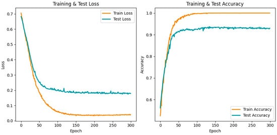 The P300-STTCNet model achieved an average classification accuracy of 93.37% (95% CI: 90.92–95.82%) on the test set for distinguishing PTSD from HC, with the detailed training results shown in Figure 9. The model’s average classification performance on the test set was as follows: precision 94.48% (95% CI: 92.32–96.64%), recall 92.46% (95% CI: 91.39–93.53%), and F1 score 93.43% (95% CI: 91.97–94.89%). The left panel of Figure 9 depicts the loss curves for both the training and test sets, showing a gradual decrease in loss that stabilizes as training progresses. The right panel illustrates the trends in the training and test accuracies, with the yellow line representing the training set and the blue line representing the test set.