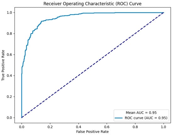 The proposed P300-STTCNet model achieved an Area Under the Receiver Operating Characteristic Curve (AUC) of 0.95 in the classification task, as shown in Figure 10.