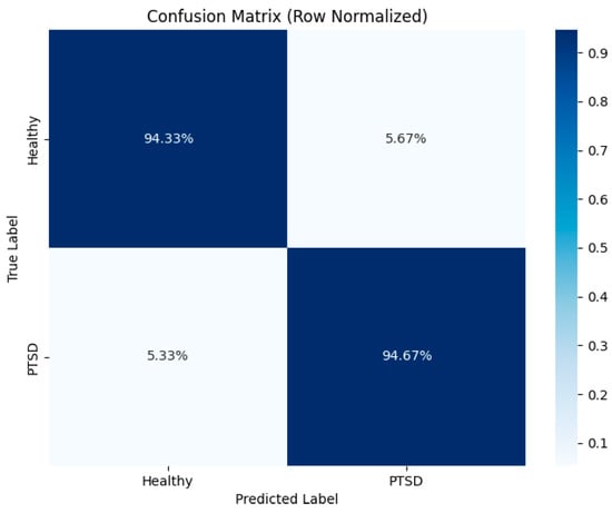 Figure 11 presents the confusion matrix of the P300-STTCNet model for the PTSD versus HC classification task, with row-wise normalization applied. The vertical axis represents the true labels, and the horizontal axis corresponds to the predicted labels, while the color bar on the right indicates the normalized proportion range. This confusion matrix provides a visual assessment of the model’s classification performance, where diagonal elements denote correctly classified proportions and off-diagonal elements represent misclassification rates.