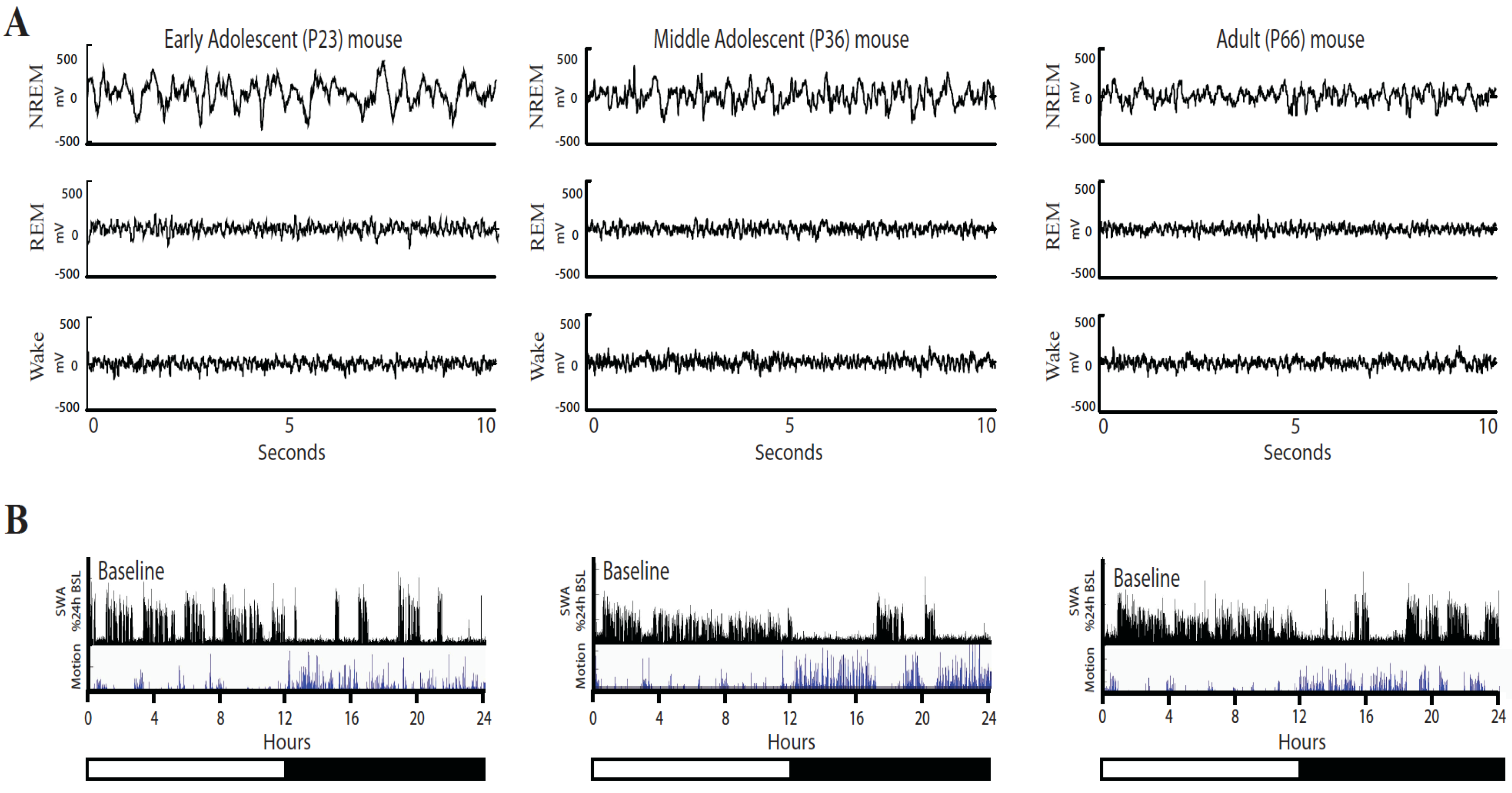 Representative examples of EEG traces in adolescent and adult mice. (A) EEG traces (10 s) for NREM sleep, REM sleep, and wake in an early adolescent (P23), middle adolescent (P36) and adult (P66) mouse are shown. (B) The bottom panels show the time course of NREM slow wave activity (SWA, expressed as % of 24-h mean SWA, 4-s epochs) and locomotor activity (video-based motion detection, 4-s epochs) for the same animals during 24 h of baseline. Motion is measured in arbitrary units and values cannot be compared across animals.
