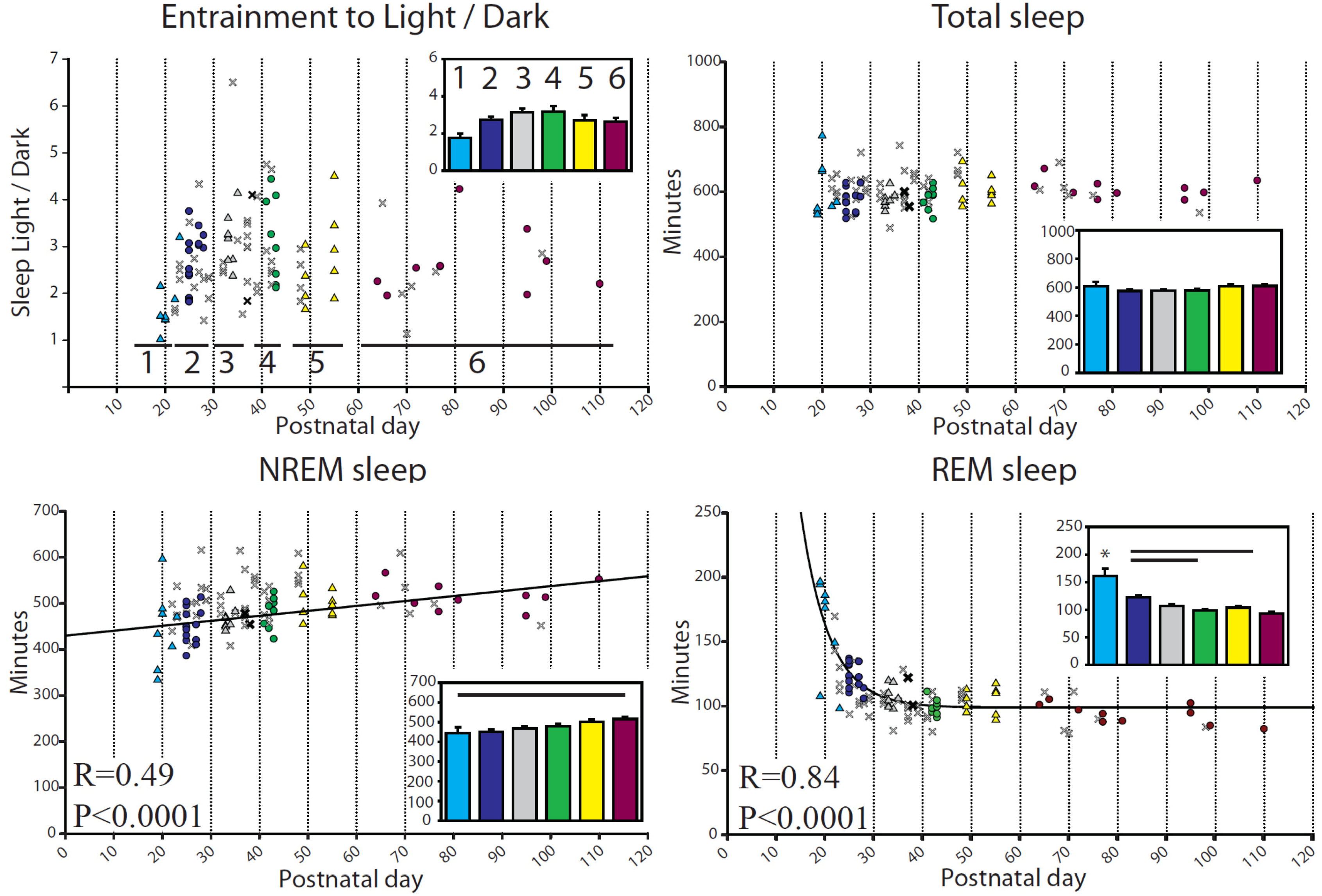 Daily sleep and wake amounts (min/24 h) during baseline for each mouse. In all figures, symbols show values for each mouse, with P and R corresponding to the regression line computed from all animals except those denoted by a faint “X”. Insets depict group means ± SEM, with bars indicating significant differences between groups, and asterisks indicating one group different from all others (p < 0.05, Tukey’s HSD). Age groups in all figures: 1≤P25; 2= P26–29; 3= P34–36; 4= P41–44; 5= P50–56; 6≥P60. Age ranges correspond to those chosen for the acute sleep deprivation experiment. The bold “X” are baseline days, i.e., the days just before the sleep deprivation day, and are included in the regression analysis. The faint X denotes additional scored days from the same mice that did not qualify as “baseline” (i.e., they occurred >1 day before sleep deprivation, or at least 3 days afterwards). The x days are included for reference only but were not used for the ANOVA. In this figure, NREM sleep is fit to age with a linear relationship, f = y0 + a × x, (f = min NREM, y0 = 429.98, a = 1.08, x = Postnatal day) while REM sleep is fit to age with an exponential decay, f = y0 + a × exp(−b × x), (f = min REM, y0 = 98.80, a = 2012.99, b = 0.17, x = Postnatal day).