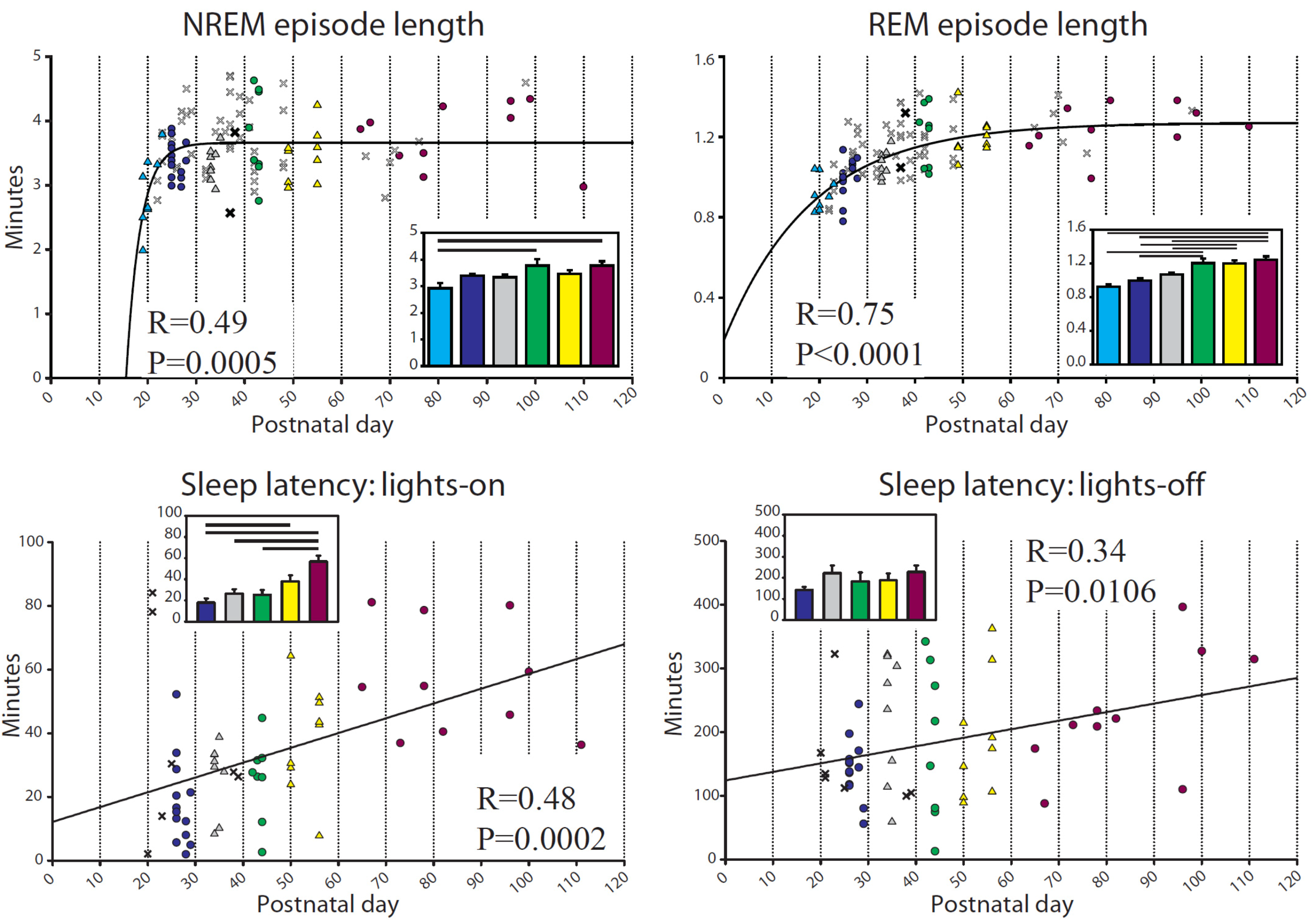 Episode duration and sleep latency during baseline. For episode length, p and R are from the regression for an exponential equation increasing to a maximum, f = y0 + a × [1 − exp(−b × x)] (top left: f = min, y0 = −407.10, a = 410.67, b = 0.32, x = Postnatal day), (top right: f = min, y0 = 0.19, a = 1.08, b = 0.054, x = Postnatal day); for sleep latency, p and R are from the linear regression (f = y0 + a × x) (bottom left: f = min, y0 = 12.12, a = 0.47, x = Postnatal day; bottom right: f = min, y0 = 120.45, a = 1.41, x = Postnatal day).