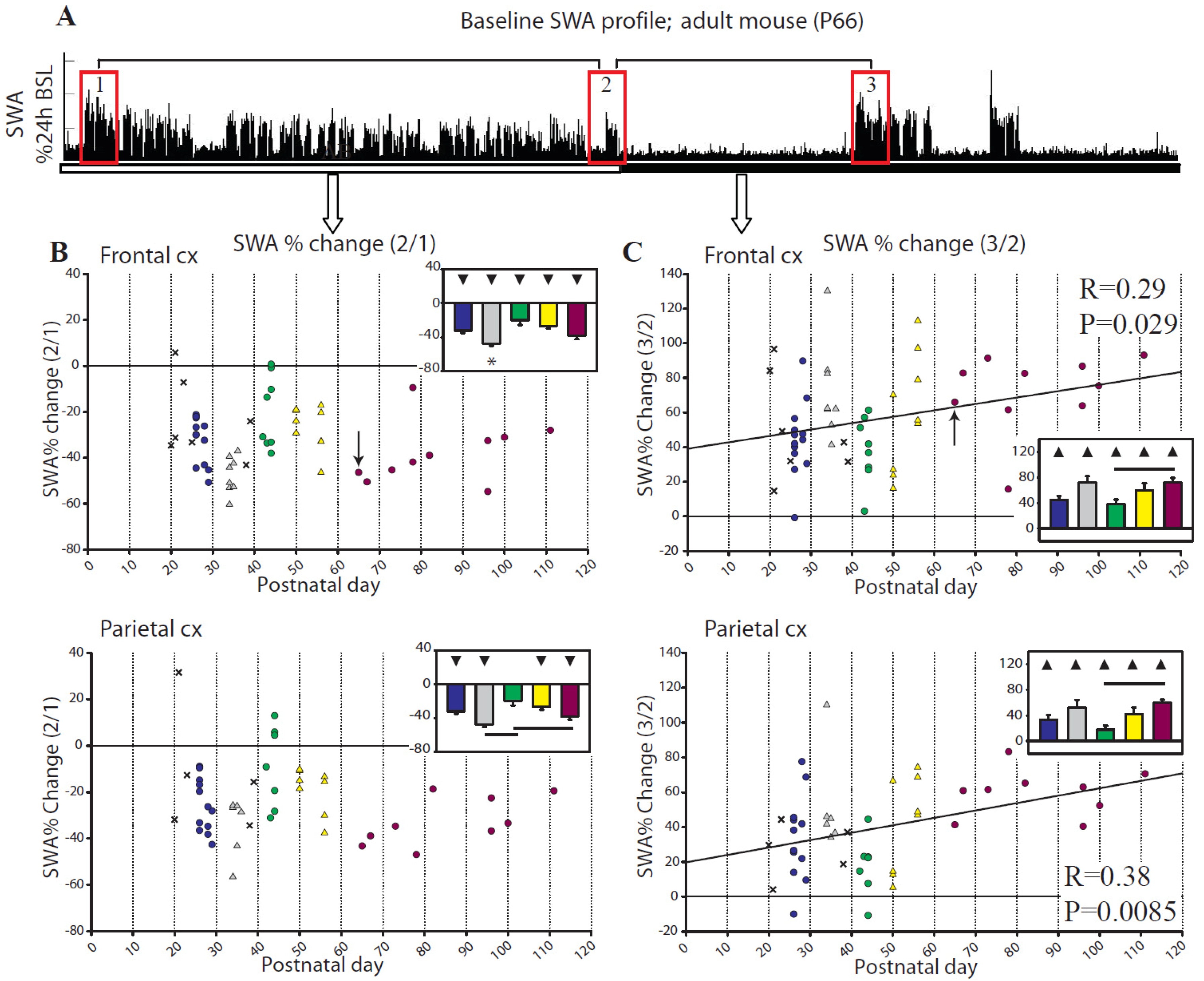 Baseline changes in relative NREM SWA. (A) shows changes in relative SWA for the frontal derivation in a representative adult (P66) mouse (indicated by an arrow in B,C). Boxes 1,2,3 indicate first and last hour of consolidated sleep during the light period, and first hour of consolidated sleep at night, respectively. The ratios 2/1 and 3/2 were used for the analysis shown in (B) and (C). Bars show differences across groups (Tukey’s HSD), and triangles indicate group means different from 0 (t-test; filled symbols p<0.05).