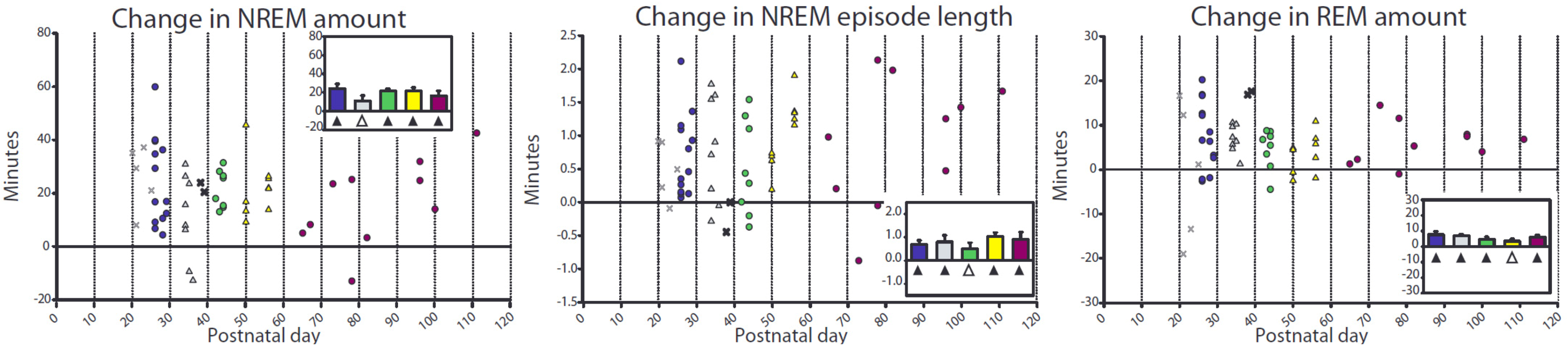 Changes in sleep duration after sleep deprivation. Each faint “X” denotes a mouse that underwent a 2 h deprivation and is included only as a reference. Left and middle panels show the difference (in min) in NREM amount and NREM episode length during the first 4 h of recovery sleep (starting at noon) relative to the first 4 h of baseline sleep (starting at 8 a.m.), while the right panel shows changes in REM amount during the first 8 h of recovery sleep (from noon until lights-off at 8 p.m.) relative to the first 8 h of baseline sleep. Triangles indicate group mean different from 0 (paired 2-tailed t-test; filled symbols p < 0.05, empty symbols p < 0.1).