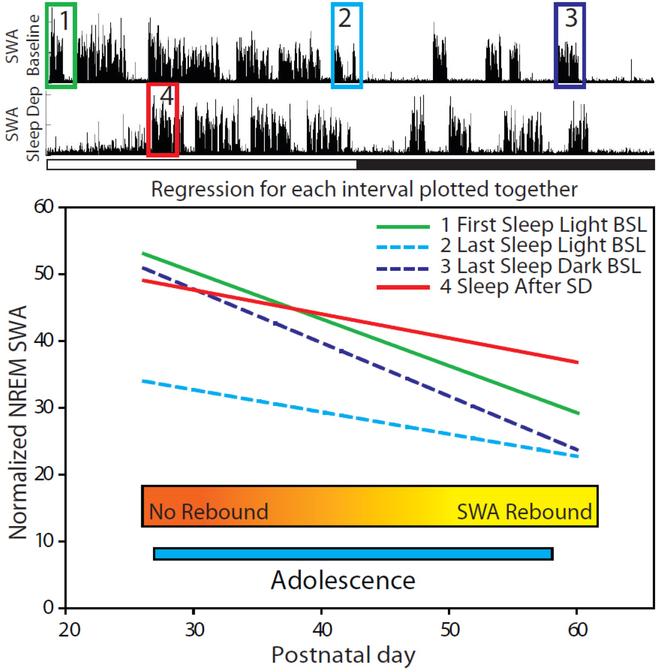 Despite the lack of SWA increase, the youngest groups of mice (P26–29, P34–36) showed an increase of frequencies around 10 Hz after sleep deprivation, as did all the other experimental groups. In adults, it is well established that the increase in EEG frequencies after sleep deprivation is not confined to the SWA range, but often extends to the theta and alpha band (~0.5–11 Hz; e.g., [64,65,66]). Classically, theta (5–9 Hz) activity has been described as the wake EEG marker of sleep need [30,32,36], but recent studies show that local changes in wake theta activity correlate with local changes in sleep SWA, and suggest that the same cellular mechanisms may underlie both slow waves and theta waves [67,68]. In human infants (2–9 months old), low range (<1.75 Hz) SWA does not decline monotonically during the night, while theta activity (6.5–9 Hz) does, prompting the suggestion that during early development theta activity during sleep may be able to reflect sleep homeostasis before SWA [69]. Our data are consistent with this interpretation, but also suggest that SWA fails as a homeostatic marker because of saturation.