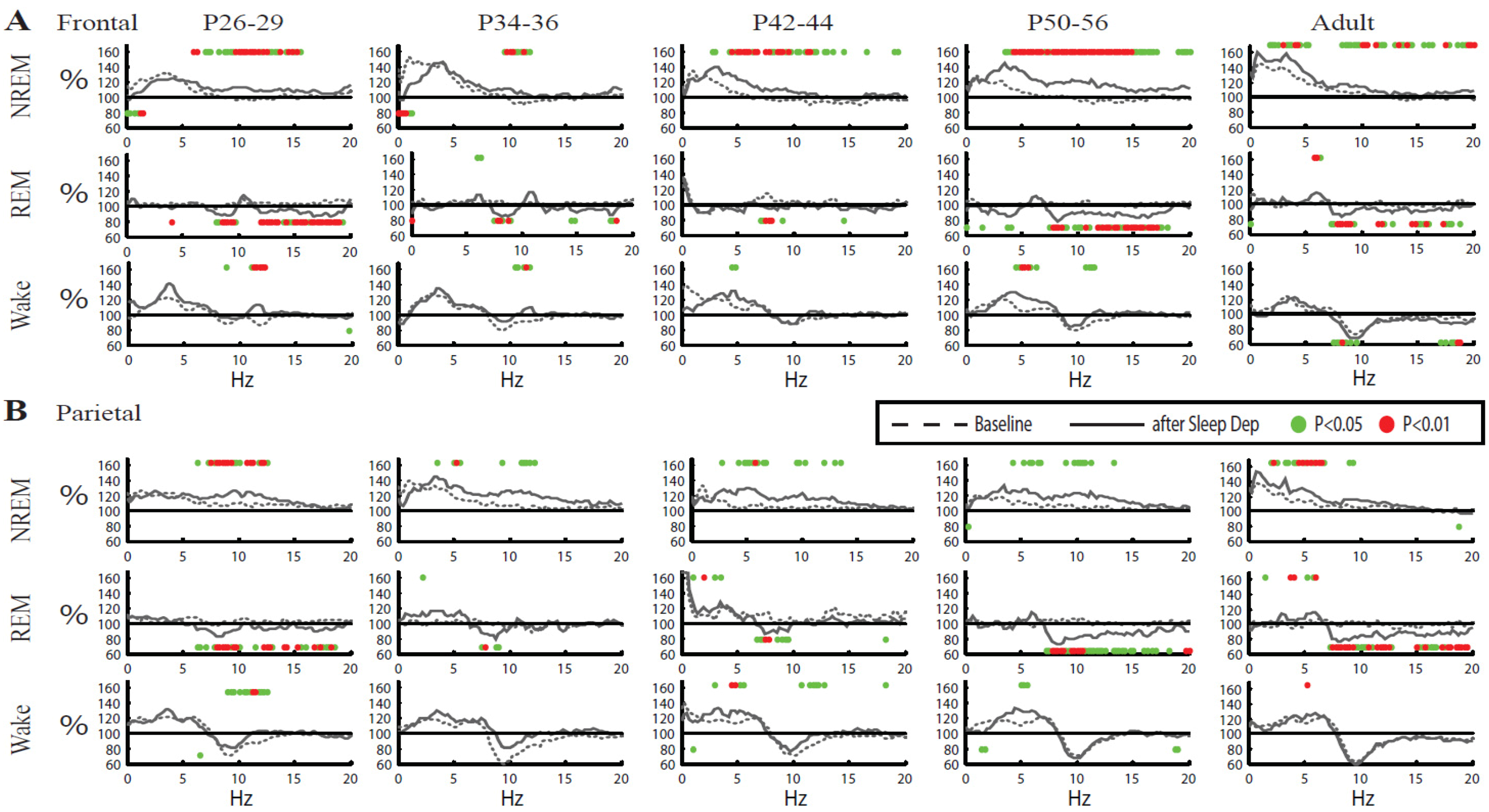 While structural and electrophysiological aspects of cortical maturation are reasonably well understood, a complete quantitative description of sleep patterns during the entire adolescence period is missing in rodents. Previous studies recorded sleep at a few select times during adolescence, and in some cases only during part of the light phase [11,13,14,15,16,17,18]. Even less characterized is how sleep homeostatic mechanisms develop and change during adolescence. Four studies have been conducted in rats sleep deprived for 2–6 h during adolescence [17,19,20,21]. Consistently, these experiments found evidence of sleep homeostasis well before weaning (as early as P12), as indexed by changes in sleep amount (e.g., increased duration of NREM sleep) and in sleep consolidation (e.g., decreased number of brief arousals) [17,19]. The same studies, however, found that only some time between the third and the fourth week of age NREM slow wave activity, the EEG power in the 0.5–4.5 Hz range during NREM sleep, becomes a reliable marker of sleep homeostasis as described in adults, increasing with time spent awake and declining with time spent asleep. The reasons for this delay remain unclear. Here we performed in mice a comprehensive study of the changes in sleep quantity and quality, as well as in the response to sleep deprivation, from early adolescence to adulthood.