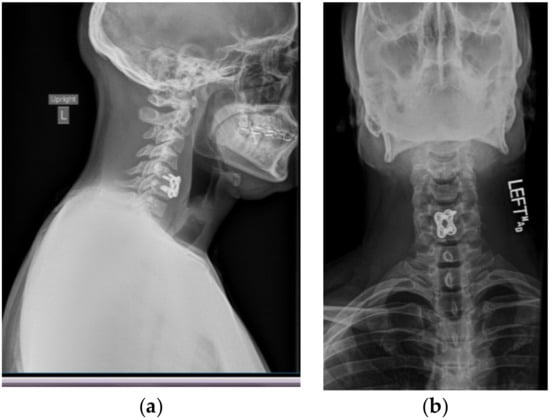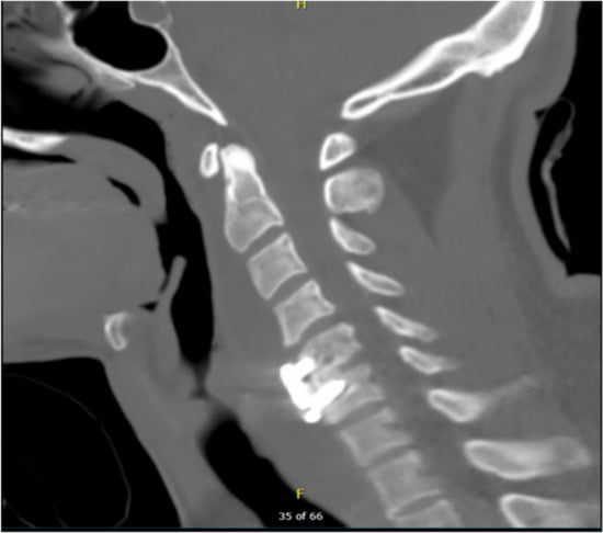 A postoperative CT scan confirmed the proper anterior fixation of the plate screws, interbody device, and bone graft placement following the patient’s discectomy and arthrodesis (Figure 2). Postoperative anterior and lateral X-rays (Figure 3b,a respectively) were also obtained in order to visualize and confirm proper placement of the anterior cervical plate and evaluation of alignment.