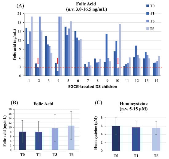 Mean plasma folate level in DS children, considered as a group, did not show significant differences during the study (Figure 1B). However, when patients’ profiles were analyzed individually, plasma folic acid decreased below the lower reference range in 3 out of 14 DS children (21.4%) as shown in Figure 1A. In patient #2, folic acid dropped from 4.2 ng/mL at the baseline to 2.9 ng/mL after 1 month of supplementation (T1); in patient #4, folic acid declined from 4.4 ng/mL at T0 to 1.65 ng/mL at T1; in patient #10, folic acid lowered to 2.6 ng/mL after 3 months of EGCG (T3) supplementation. Those children were treated with levofolinic acid (2.5 mg on alternate days) for 2 months with restoration of plasma folates while keeping EGCG dose unchanged until T6. We did not observe any decline of folic acid after the end of levofolinic acid supplementation.