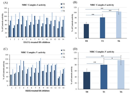 The mitochondrial complex I and V activities were measured in PBMCs of DS children before EGCG supplementation (T0) and after 1 (T1) and 6 months (T6) of therapy (Figure 2A,C). Results are represented as percentage of the MRC complex activity of the control group without T21 (Group 3, healthy children).
