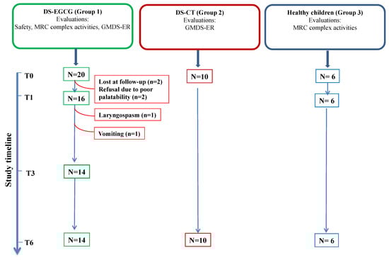 Study diagram. DS-EGCG: DS children treated with EGCG (Group 1); DS-CT: DS control group (Group 2); Healthy children (Group 3). N, patient number; safety evaluation was performed at baseline (T0), after 1 month (T1), after 3 months (T3) and after 6 months (T6) of EGCG supplementation. Griffiths Mental Developmental Scales—Extended Revised (GMDS-ER) evaluations were performed at T0 and at T6. Mitochondrial respiratory chain (MRC) complex activities were evaluated at T0, T1 and T6. Red lines indicate patient’s dropout.