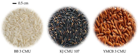 - Thiranusornkij, L.; Thamnarathip, P.; Chandrachai, A.; Kuakpetoon, D.; Adisakwattana, S. Comparative studies on physicochemical properties, starch hydrolysis, predicted glycemic index of Hom Mali rice and Riceberry rice flour and their applications in bread. Food Chem. 2019, 283, 224–231. [Google Scholar] [CrossRef]