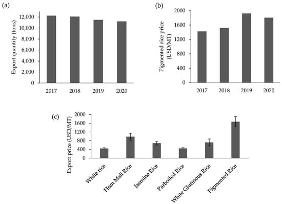 Thailand’s export quantity (a) and price (b) of pigmented rice and the average price of selected rice types (c) during 2017 to 2020. Source: drawn using data from OAE 2021.