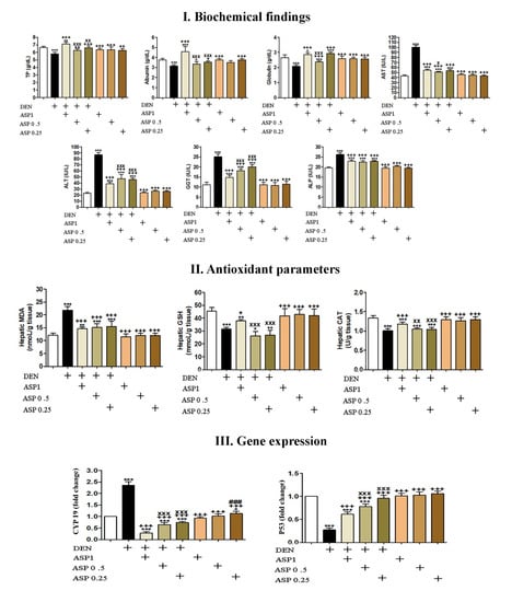 (I) Biochemical assessment of: Total proteins (TP), albumin, globulins, AST, ALT, GGT, and ALP. (II) Hepatic oxidative stress and antioxidant status: MDA, GSH, CAT. Data were analyzed with one-way ANOVA followed by Tukey’s multiple comparison test. * p < 0.05, ** p < 0.01, and *** p < 0.001 vs. Control. + p < 0.05, ++ p < 0.01 and +++ p < 0.001 vs. DEN. x p < 0.05, xx p < 0.01, and xxx p < 0.001 vs. DEN + ASP1. Error bars represent mean ± SD. n = 9. (III) Expression fold changes of cytochrome P450 (Cyp19) and p53 genes in the liver. Data were analyzed with one-way ANOVA followed by Tukey’s multiple comparison test. * p < 0.05 and *** p < 0.001 vs. Control. +++ p < 0.001 vs. DEN. xxx p < 0.001 vs. DEN + ASP1. ### p < 0.001 vs. ASP1. Error bars represent mean ± SD. n = 9. Where: DEN: DEN supplied group, ASP1: group received A. awamori 1 mg/kg b.wt, ASP0.5: group received A. awamori 0.5 mg/kg b.wt, ASP0.25: group received A. awamori 0.25 mg/kg b.wt.