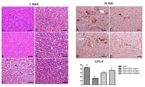 (I) Histopathological examinations of the liver in different experimental groups (A,B): Control untreated group showed normal liver structures; (C): DEN treated groups showed hepatocytes vacuolation (arrow) with an increase in mitosis (arrowheads). (D–F): DEN + ASP1, DEN + ASP0.5, and DEN + ASP0.25, respectively, showed a moderate degree of hepatocyte vacuolation with a marked decrease in mitosis. H&E, bar= 50 µm. (II) Immunolabelling of glutathione S-transferase placental form (GST-P) in livers of rats in different experimental groups. (A): DEN group, (B) DEN/ASP1 group, (C), DEN/ASP0.5 group, (D), DEN/ASP0.25 group. Arrowheads point to GST-P positive foci (brown color). Scale bar= 50 μm. Values with different letters differ significantly at (p ≤ 0.05).